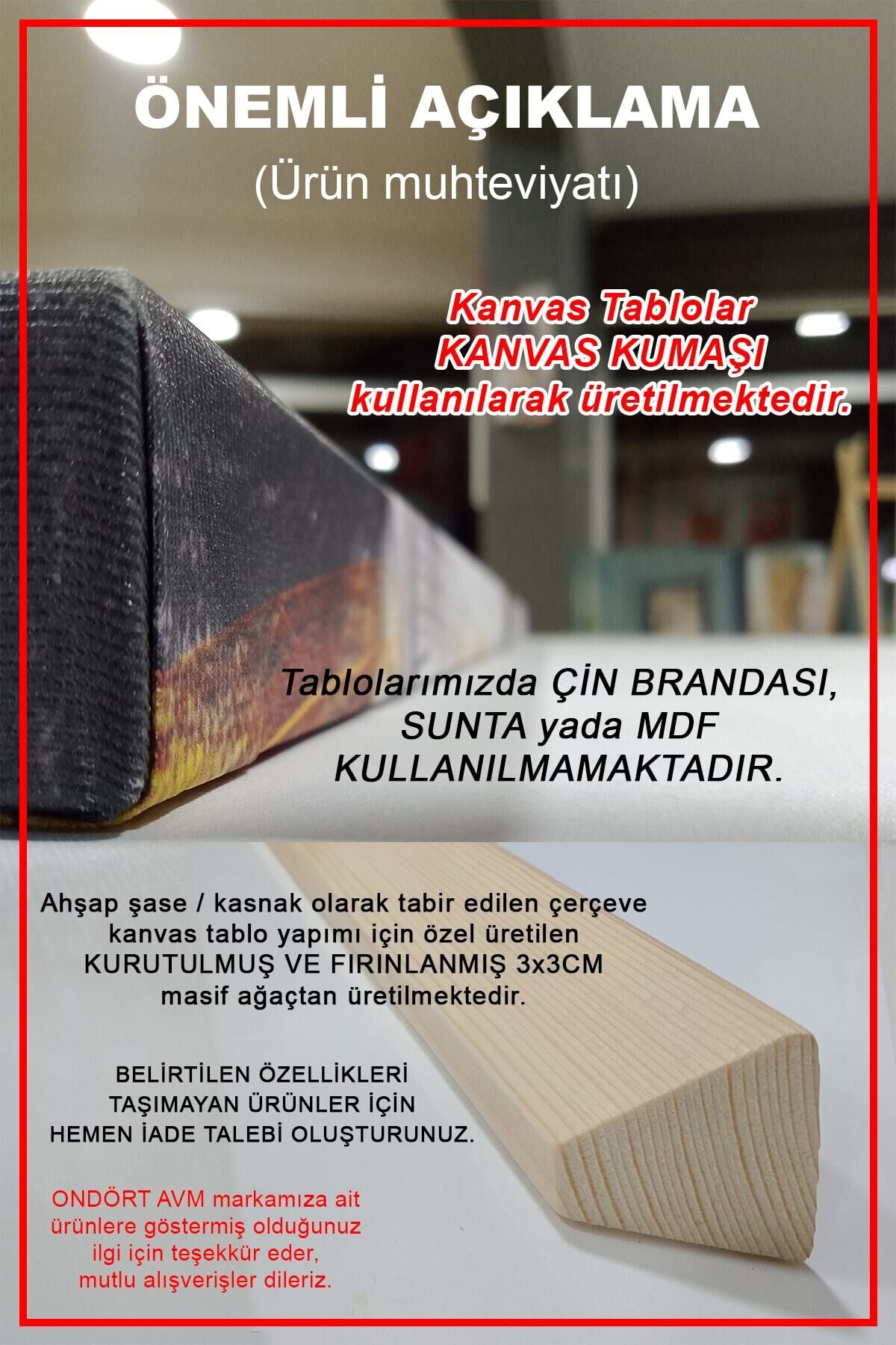 ÖNEMLİ AÇIKLAMA: Tablolarımız KANSOREJEN MADDE içermekte olan atık malzemelerden geri dönüştürülen ÇİN BRANDASI na (VİNİL) BASILMAMAKTADIR.; ; Ahşap Şase (kasnak) TALAŞ TOZU sıkıştırılmasından üretilen SUNTA dan YAPILMAMAKTADIR.; ; BASKILARIMIZ PAMUKLU KANVAS KUMAŞINA YAPILMAKTADIR.; ; AHŞAP ŞASE (KASNAK) ÖZENLE SEÇİLMİŞ, KURULULMUŞ, FIRINLANARAK SERTLEŞMESİ SAĞLANMIŞ OLAN ÇAM AĞACINDAN YAPILMAKTADIR.; ; Evinizin ve işyerinizin dekorasyonuna uyum sağlayacak, zaman geçirdiğiniz yaşam alanlarınızı en beğendiğiniz kanvas tablolar ile dekore edip, bambaşka bir hava katın.; ; 1. ; Kalite Kanva Kumaşına yapılan baskı, 3x3 cm kalınlığında KANVAS TABLO İÇİN ÖZEL OLAK ÜRETİLEN ahşap şaseye (kasnak) gerildiğinde esnemez, gergin kalır.; ; Firmamız Kanvas tablolarda en kaliteli PAMUKLU KANVAS BASKI KUMAŞI kullanır.; ; Özel olarak hazırlanan tablolar yıllar boyunca renkleri üzerinde korur ve kesinlikle akma yapmaz.; ; Baskı sırasındaki boyayı en iyi emen özelliğe sahiptir.; ; Nemli bezle kolaylıkla tozu alınabilir özelliğe sahiptir;