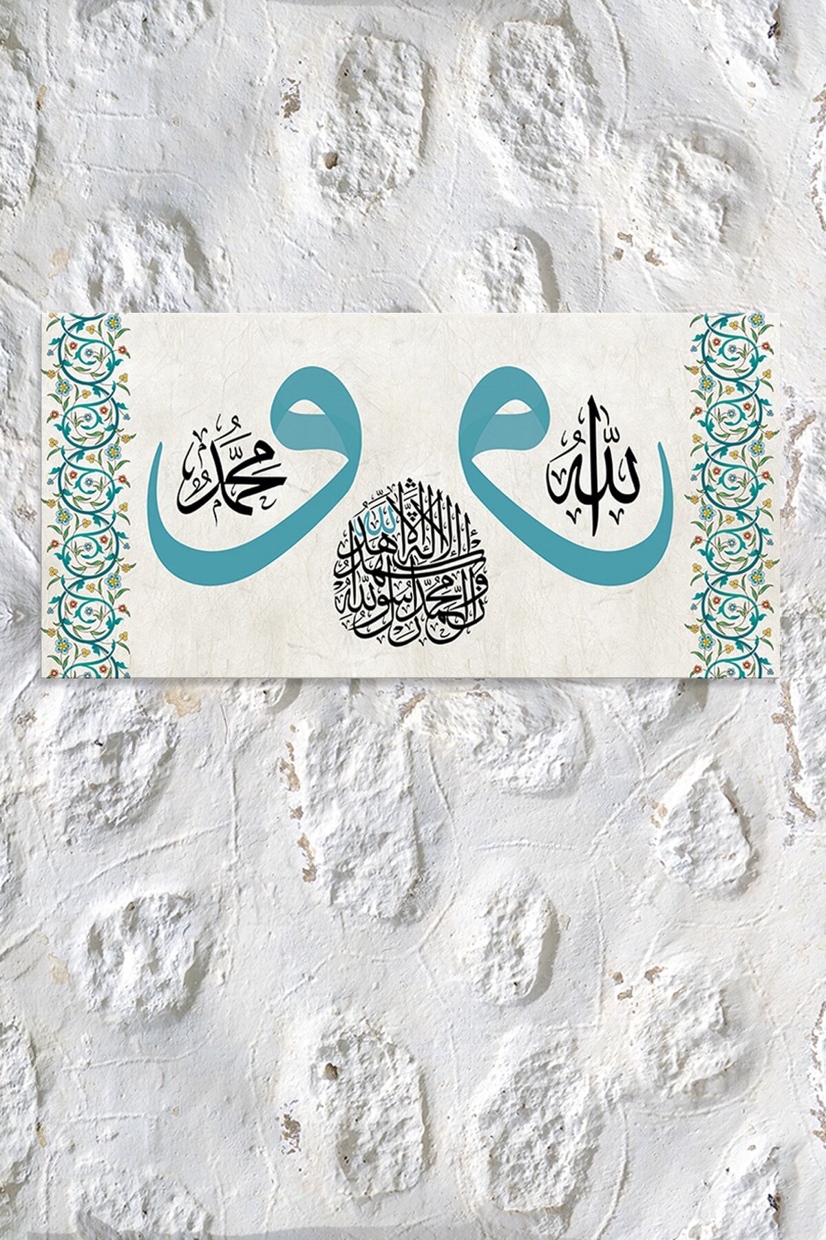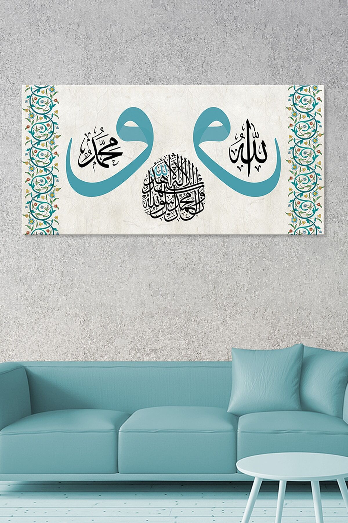 Allah (cc) Muhammed (sav) Ortada Kelimei Şehadet Yazılı Islami Dini Hat Kanvas Tablo