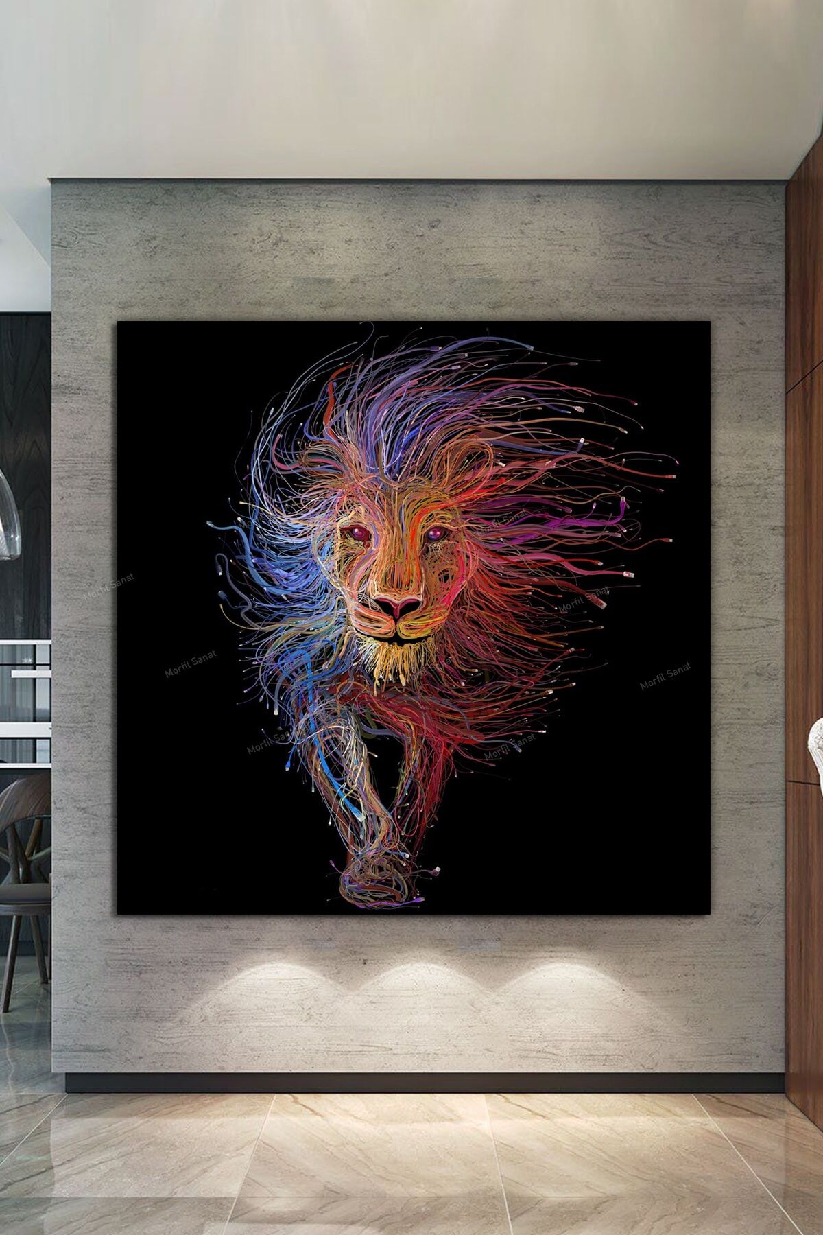 Tek parça halinde sunulan bu dijital sanatsal dekoratif kanvas tablo, mekanınıza modern ve cesur bir dokunuş katıyor; Aslan temalı bu eser, sanatseverlerin beğenisine sunulan cesur sanat stilini yansıtıyor; Yüksek kaliteli kanvas materyali sayesinde uzun ömürlü kullanım ve canlı renkler sunuyor;