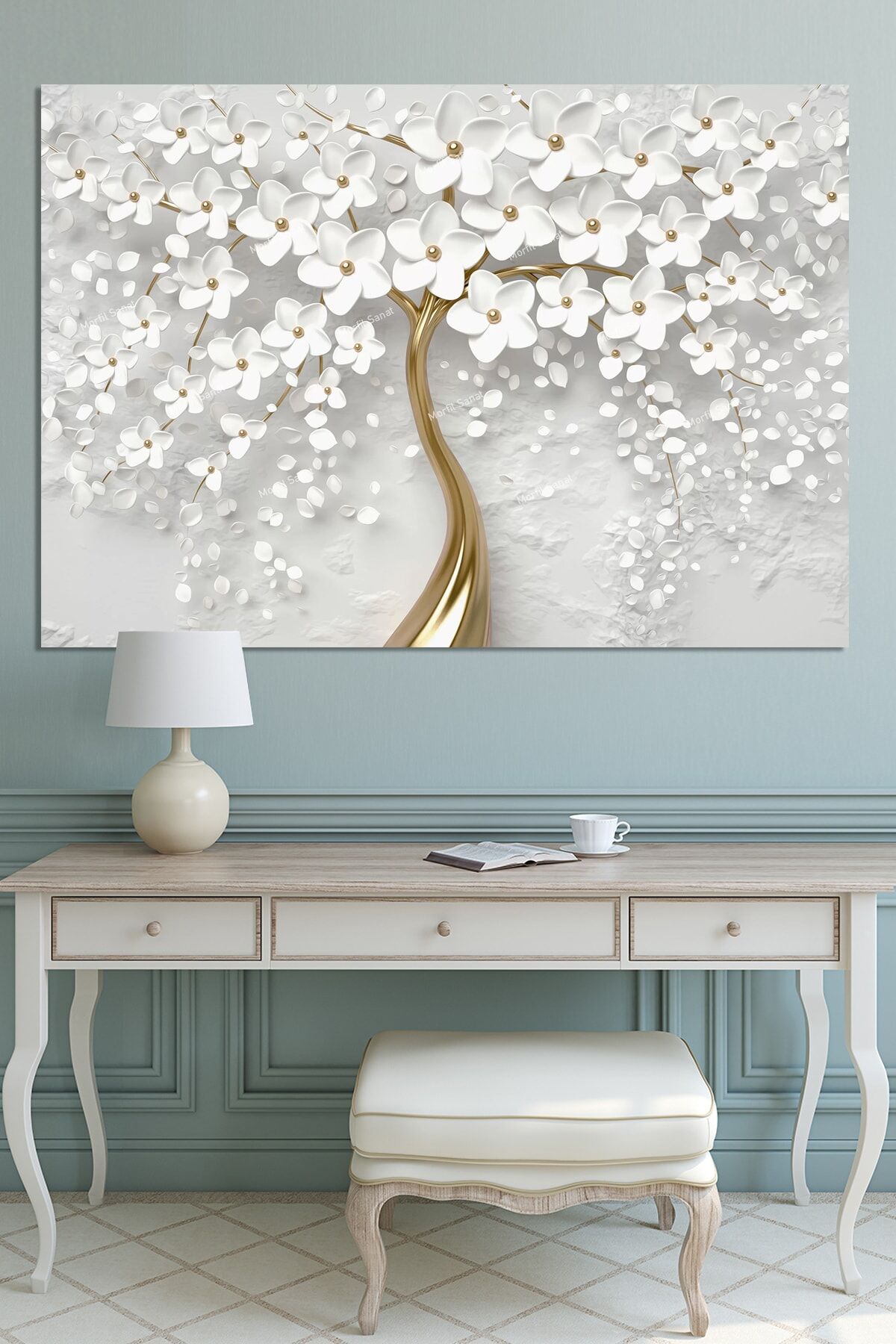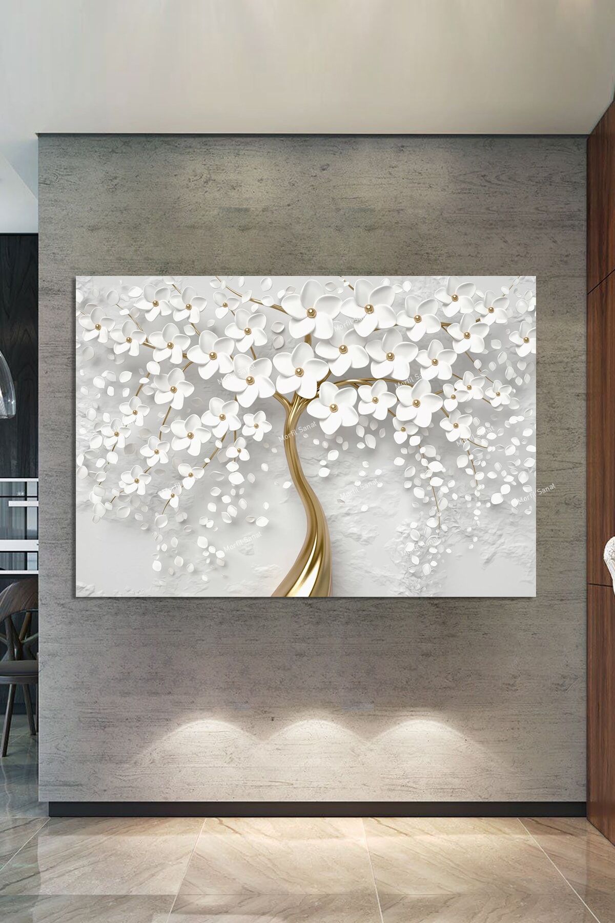Yüksek kaliteli kanvas materyal kullanılarak üretilmiş, uzun ömürlü ve dayanıklı bir yapıya sahiptir; Bitki ve çiçek temalı tasarımıyla mekanınıza doğal bir estetik katarken, beyaz altın kabartma görünümü ile modern bir dokunuş sunar; Tek parça halinde gelen bu tablo, kolay montaj imkanı sağlar ve duvarınızda şık bir görünüm oluşturur;