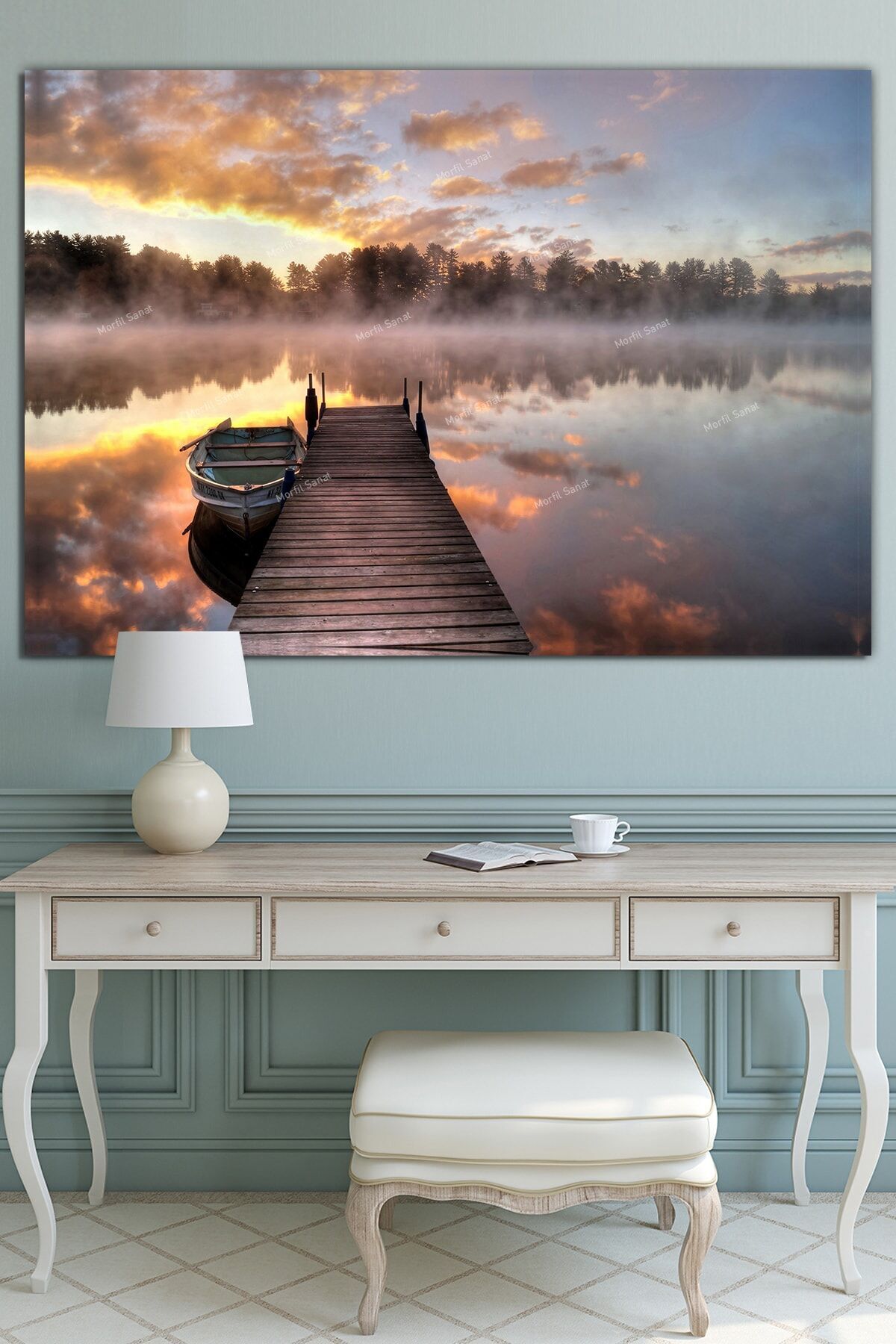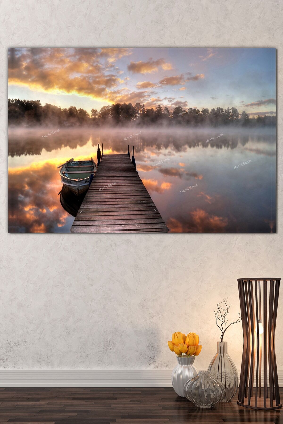 Göl Kayık Iskelede Gün Batımı Kanvas Tablo