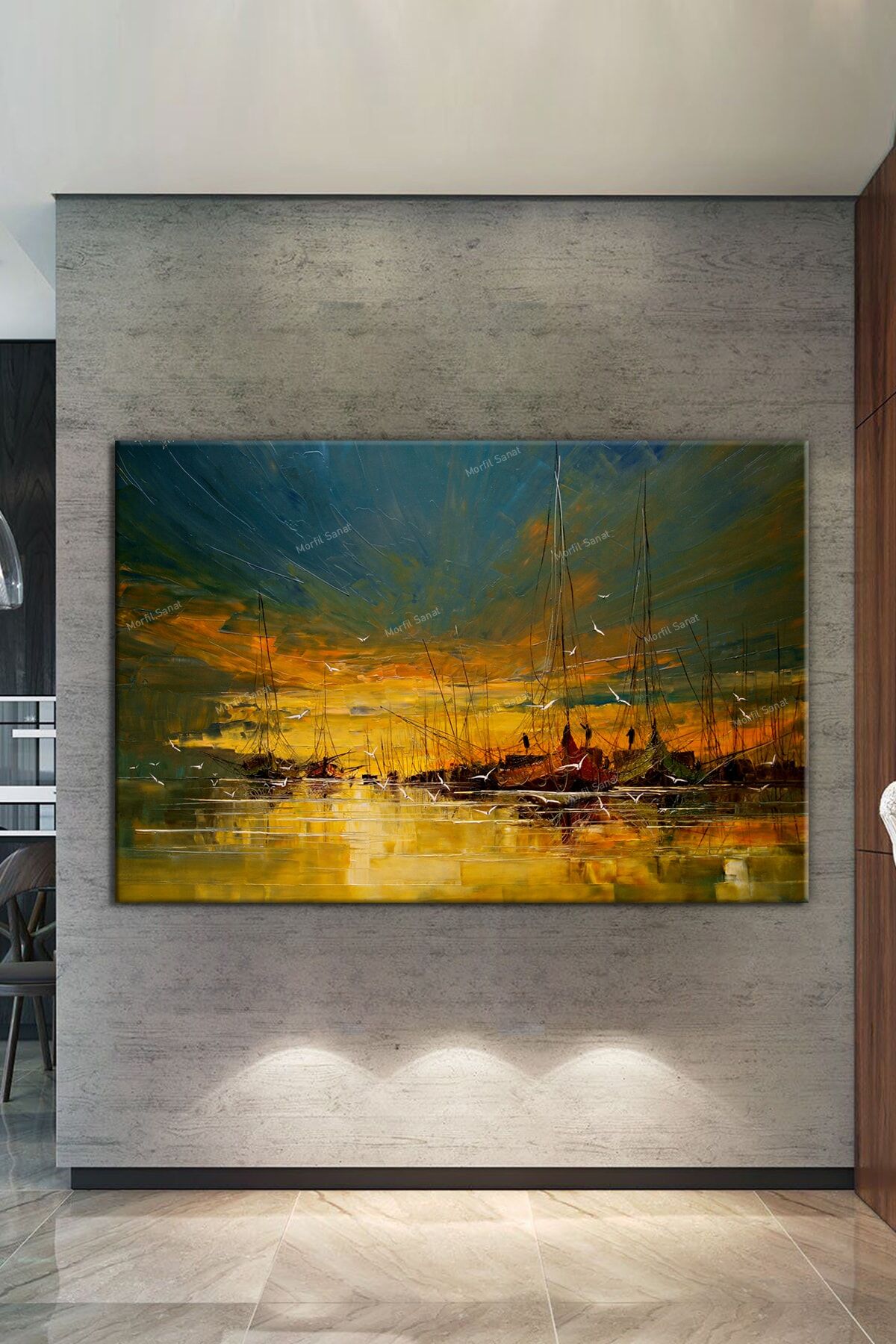 Tek parça halinde sunulan bu yağlıboya efektli kanvas tablo, kolay montaj avantajı sağlar ve duvarınızda tek seferde tamamlanmış bir sanat eseri oluşturmanızı mümkün kılar; Yüksek kaliteli kanvas materyali sayesinde uzun ömürlü kullanım sunar ve renklerin canlılığını korur, böylece yıllar boyunca estetik görünümünü muhafaza eder; Günbatımı ve yelkenliler konseptiyle tasarlanan bu tablo, deniz manzaralarının huzurunu evinizin dekorasyonuna taşır ve mekanınıza sakin bir atmosfer katar;