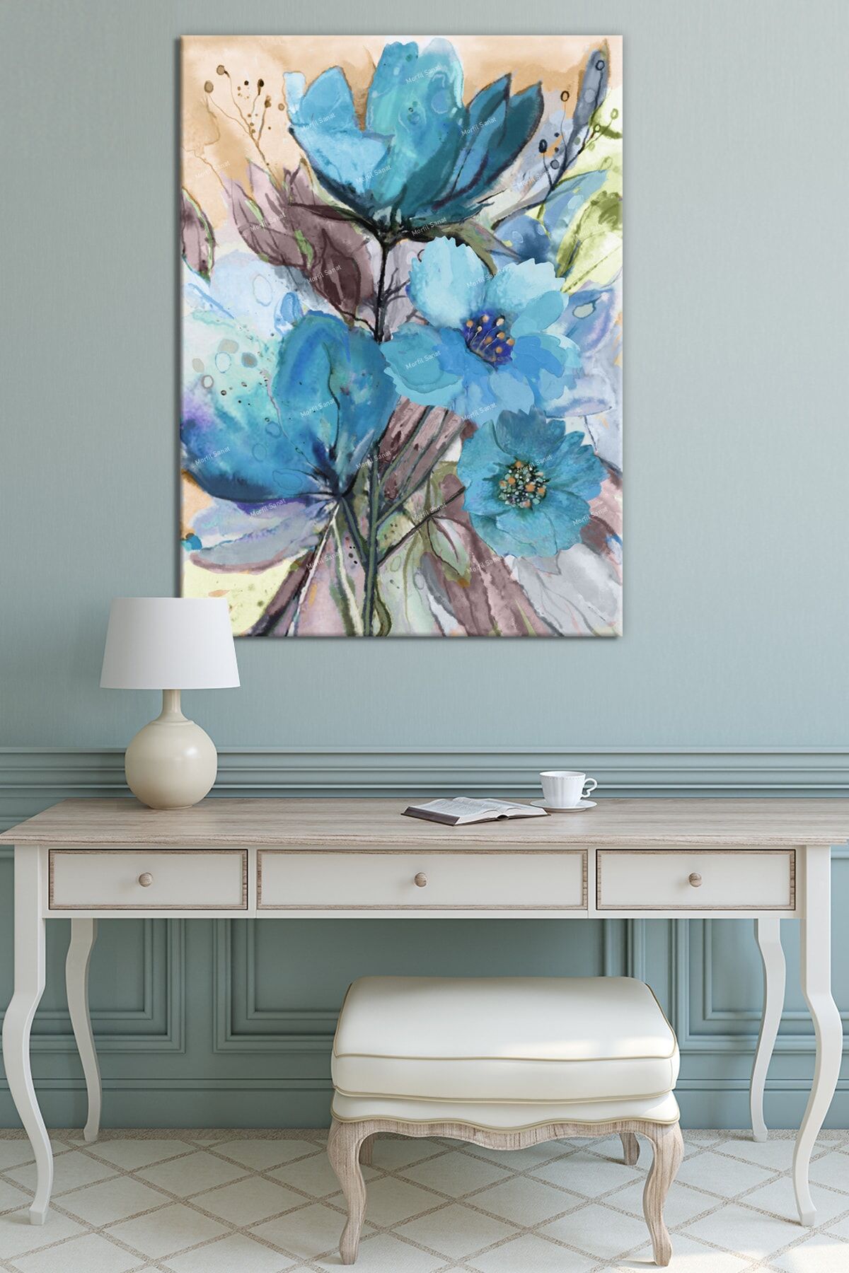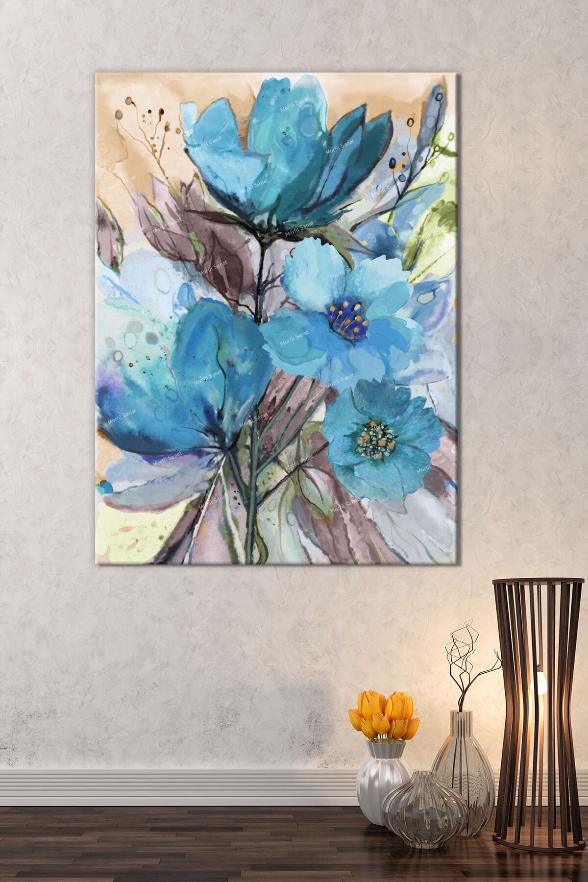 Mavi Suluboya Çiçekli Sanatsal Kanvas Tablo