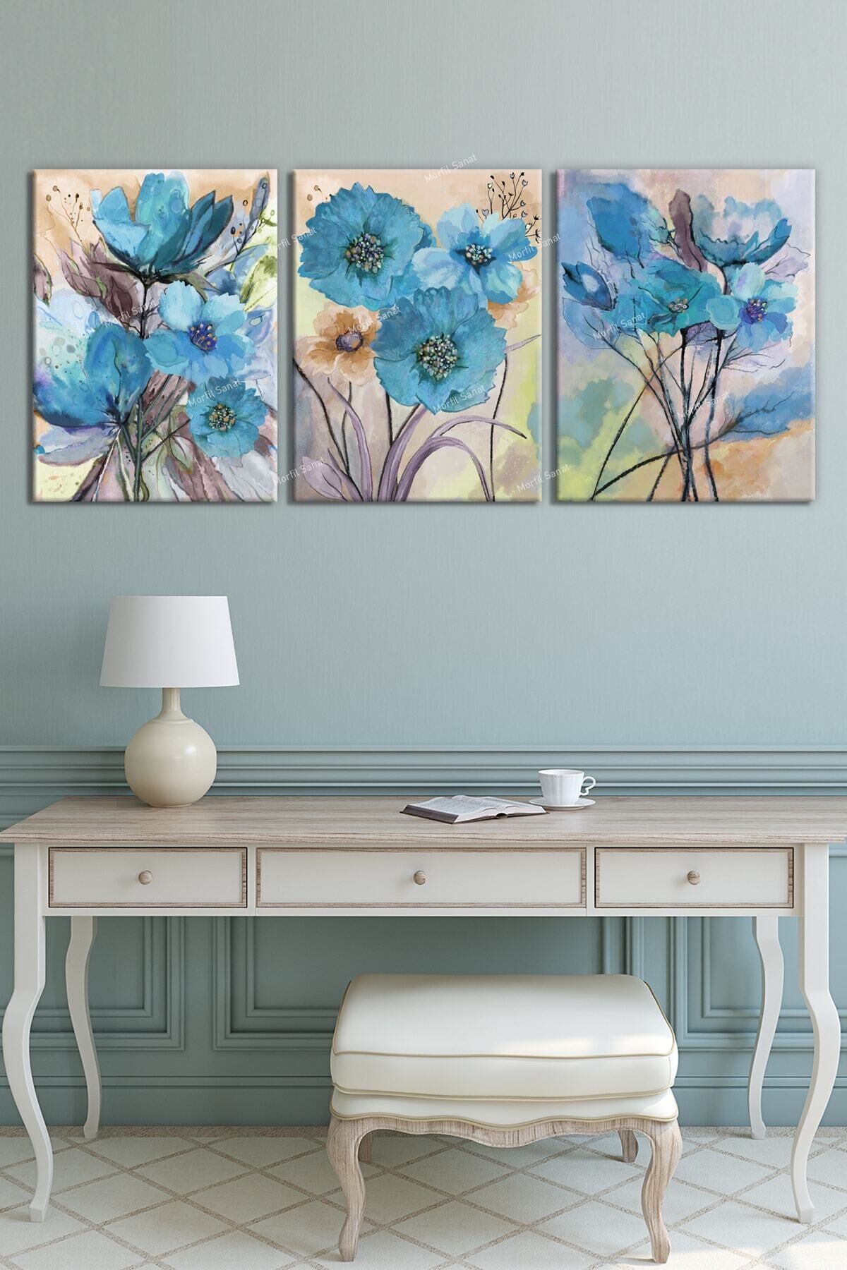Mavi Suluboya Çiçekli Sanatsal Kanvas Tablo Seti