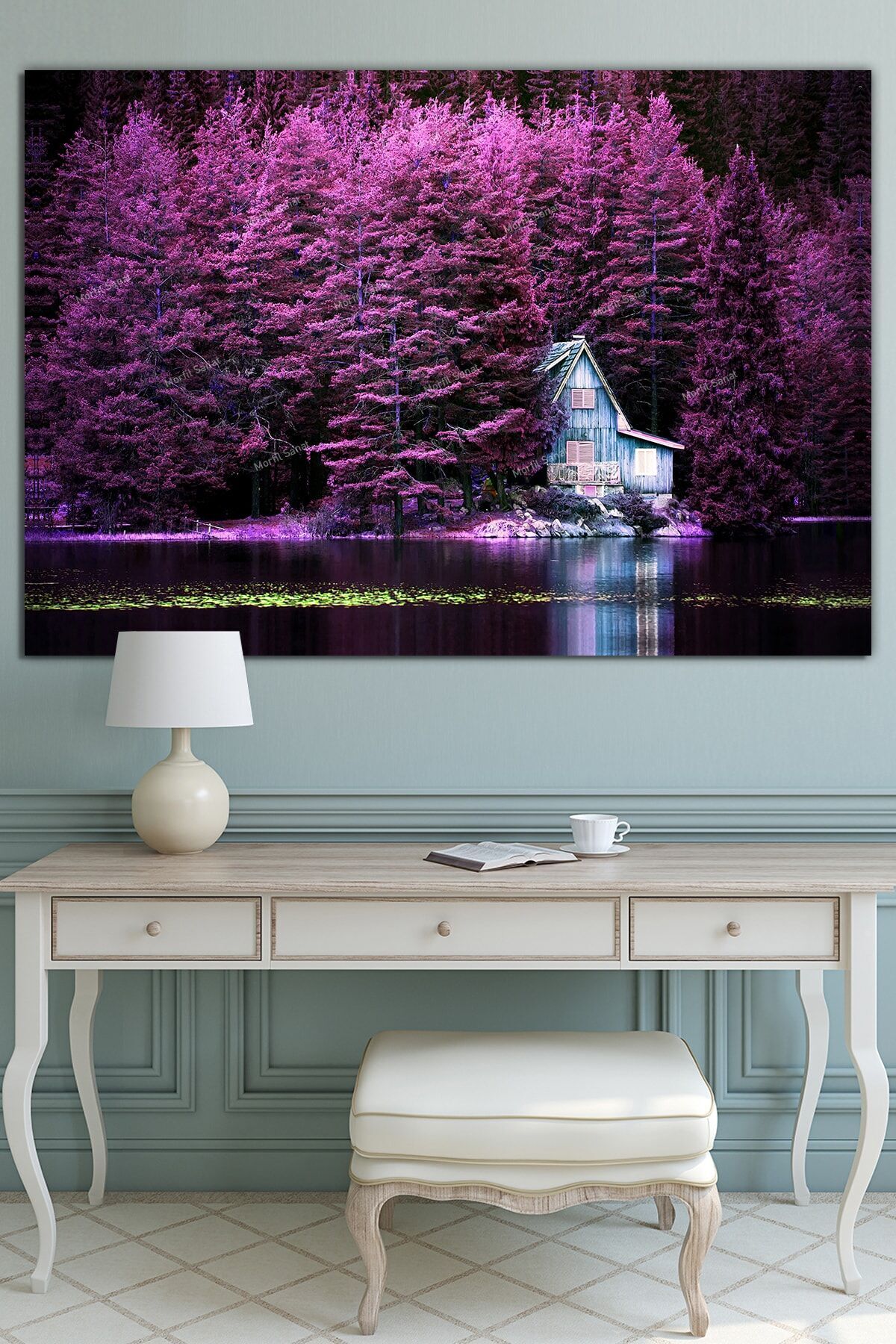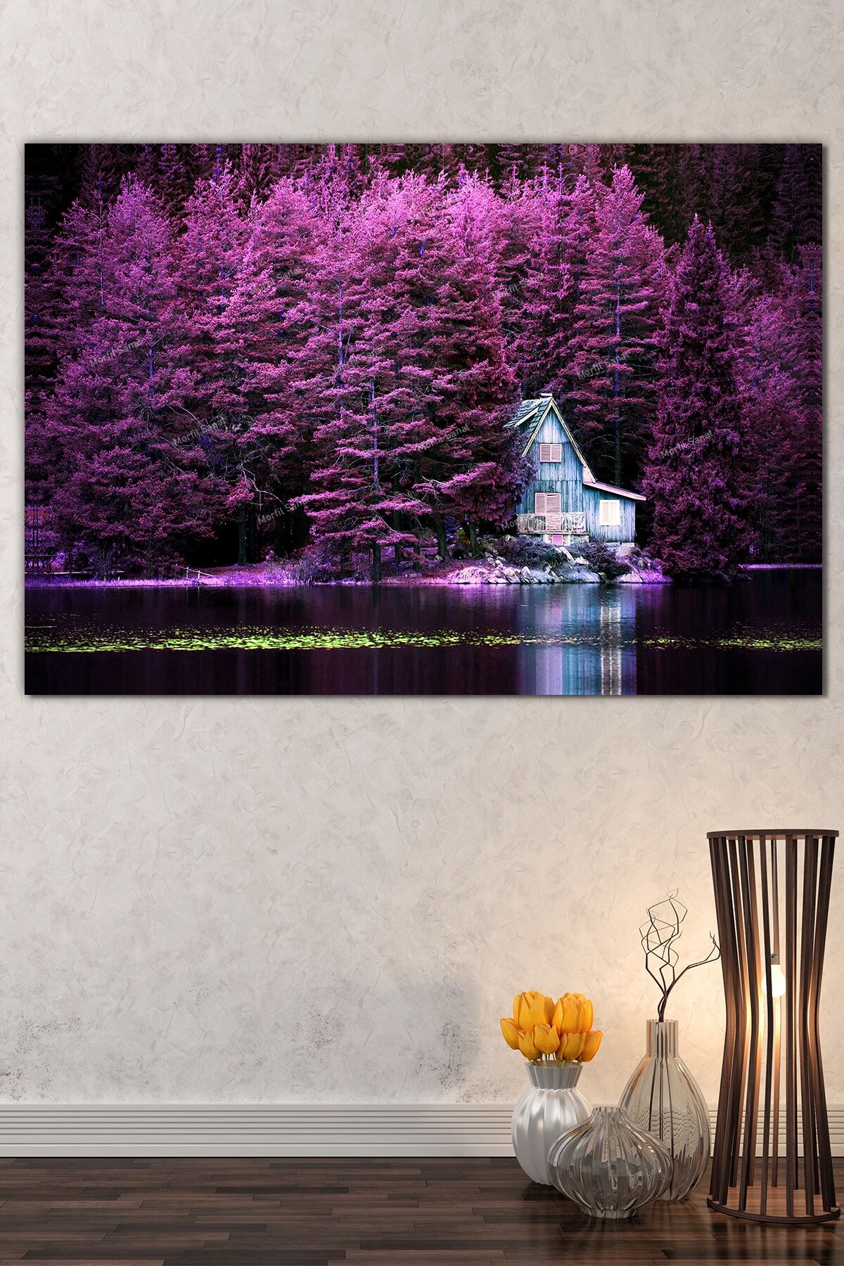 Mor Ağaşlar Ve Göl Evi Muhteşem Manzara Doğa Kanvas Tablo
