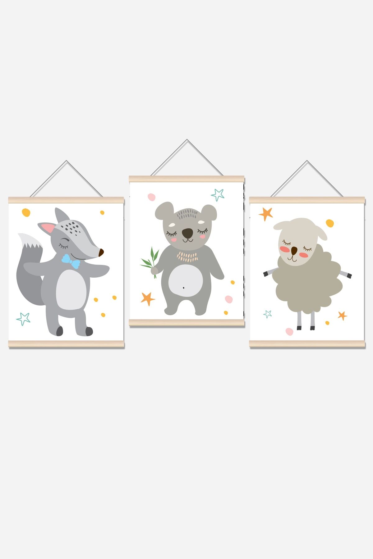 Sevimli Hayvanlar İp Askılı Çocuk Odası Kanvas Poster Tablo Duvar Dekoru