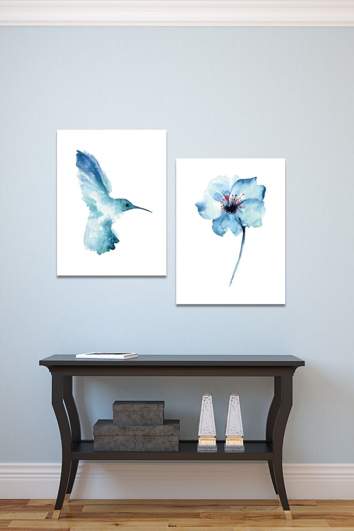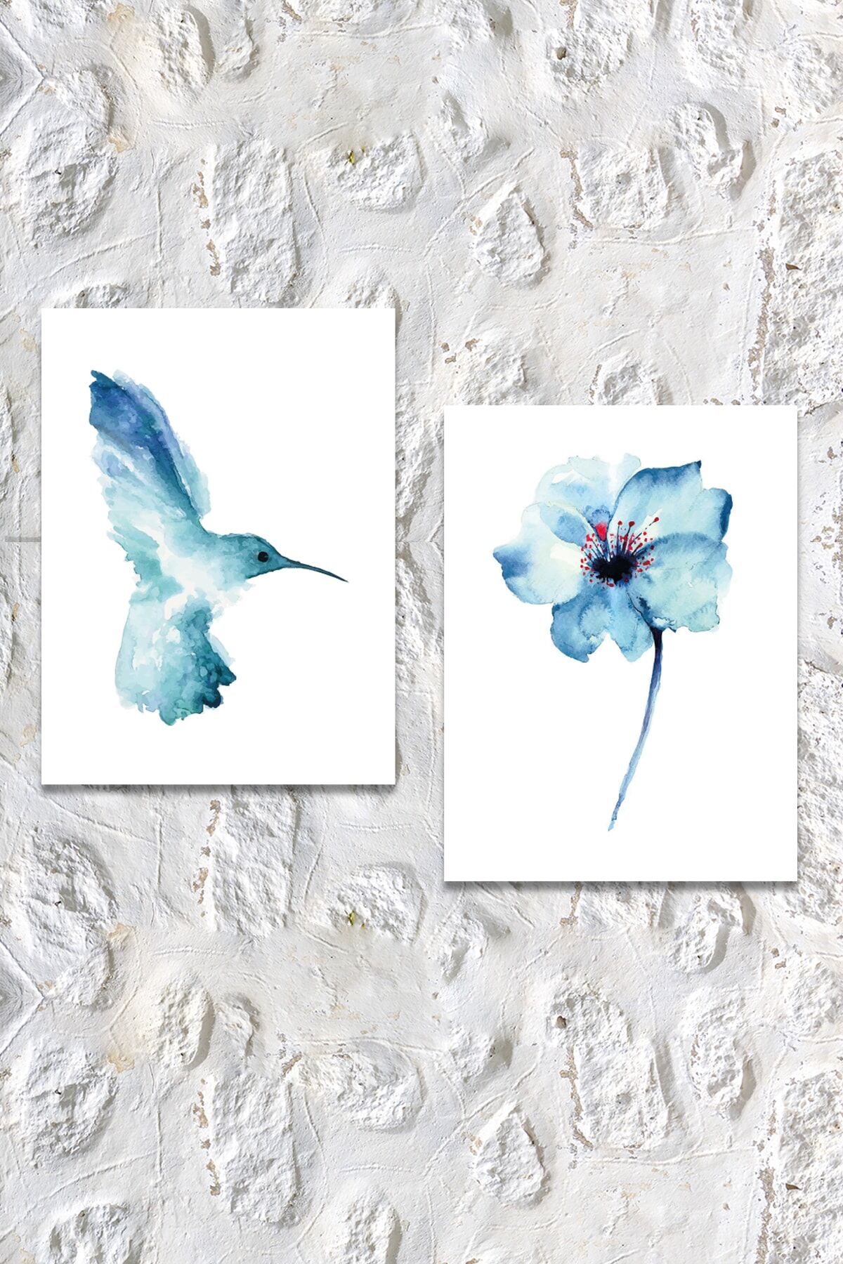 Suluboya Efektli Mavi Kuş Ve Çiçek Sanatsal Kanvas Tablo